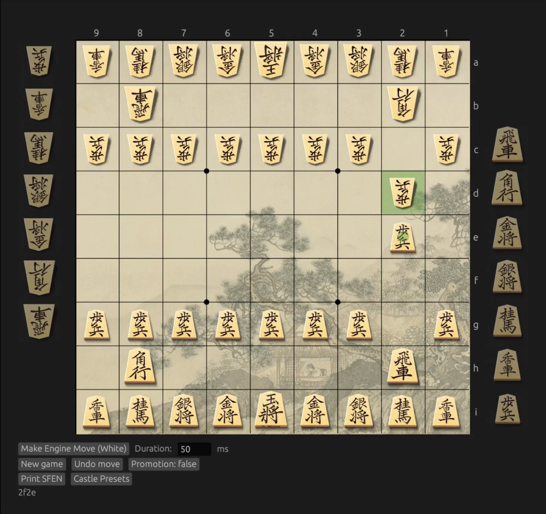 A USI-compatible shogi GUI written in Rust. For those unfamiliar with shogi, it is essentially Japanese chess and is generally considered very complex due to the ability to drop captured pieces back onto the game board. The move evaluation for this GUI is currently using the apery_rust shogi engine, and I plan to migrate to the YaneuraOu, a stronger shogi engine written in C++. I implemented joystick control with an Arduino UNO board, and plan to add support for more standard controllers such as Xbox and Playstation controllers.